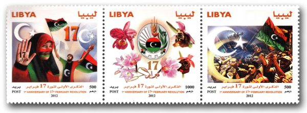 Publication Name: The 1st Anniversary of the 17th February Revolution Release date: 2012-02-17 Category: 500 + 1000 + 500 dirhams Number of stamps per sheet: 10×3 Stamp Size: 40x40mm Designer Name: Khaled Al-Tabbakh