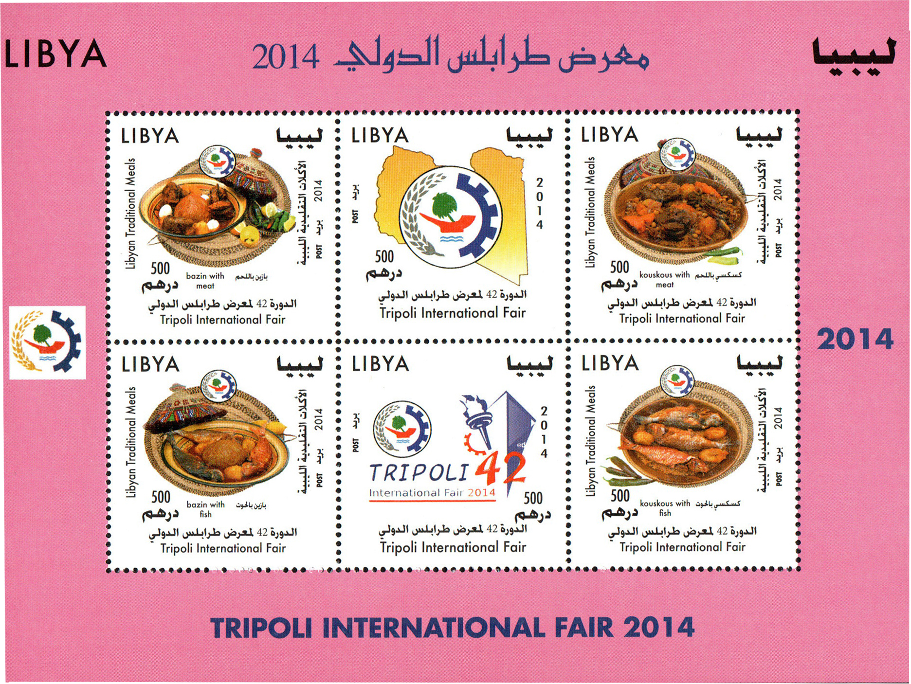 Publication Name: 42nd floor of Tripoli International Fair Release date: 2014-04-02 Category: 6 x 500 dirhams Number of stamps in the sheet: 6 Stamp Size: 40x40mm Designer Name: Khaled Al Tabakh
