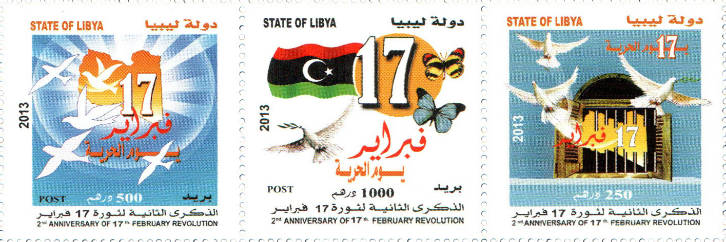اسم الاصدار: الذكرى الثانية لثورة 17 فبراير تاريخ الاصدار: 2013-02-17 الفئة: 250+500+1000 درهم عدد الطوابع في الشيت: 10×3 مقاس الطابع: 40×40مم اسم المصمم: خالد الطباخ