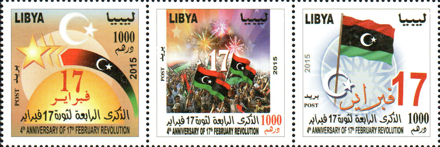 اسم الاصدار: الذكرى الرابعة لثورة 17 فبراير تاريخ الاصدار: 2015-02-17 الفئة: 1000×3 درهم عدد الطوابع في الشيت: 10×3 مقاس الطابع: 40×40 مم اسم المصمم: صلاح عمار – خالد الطباخ