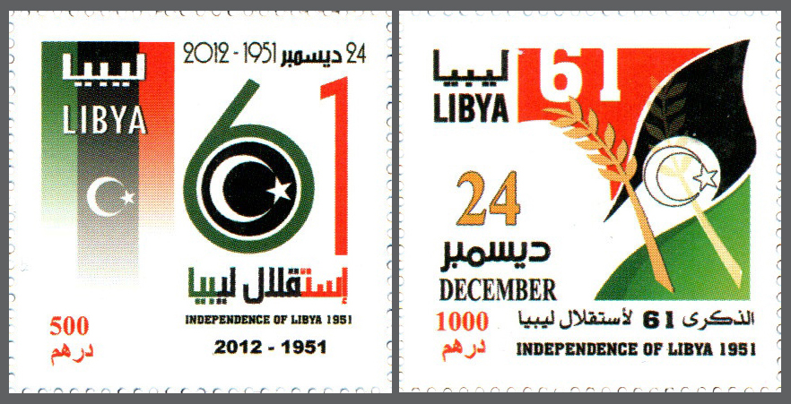 اسم الاصدار : الذكرى 61 لاستقلال ليبيا تاريخ الاصدار : 2012-12-24 الفئة : 500+1000 درهم عدد الطوابع في الشيت : 40 مقاس الطابع : 35×35 مم اسم المصمم حسام الدين العزابي